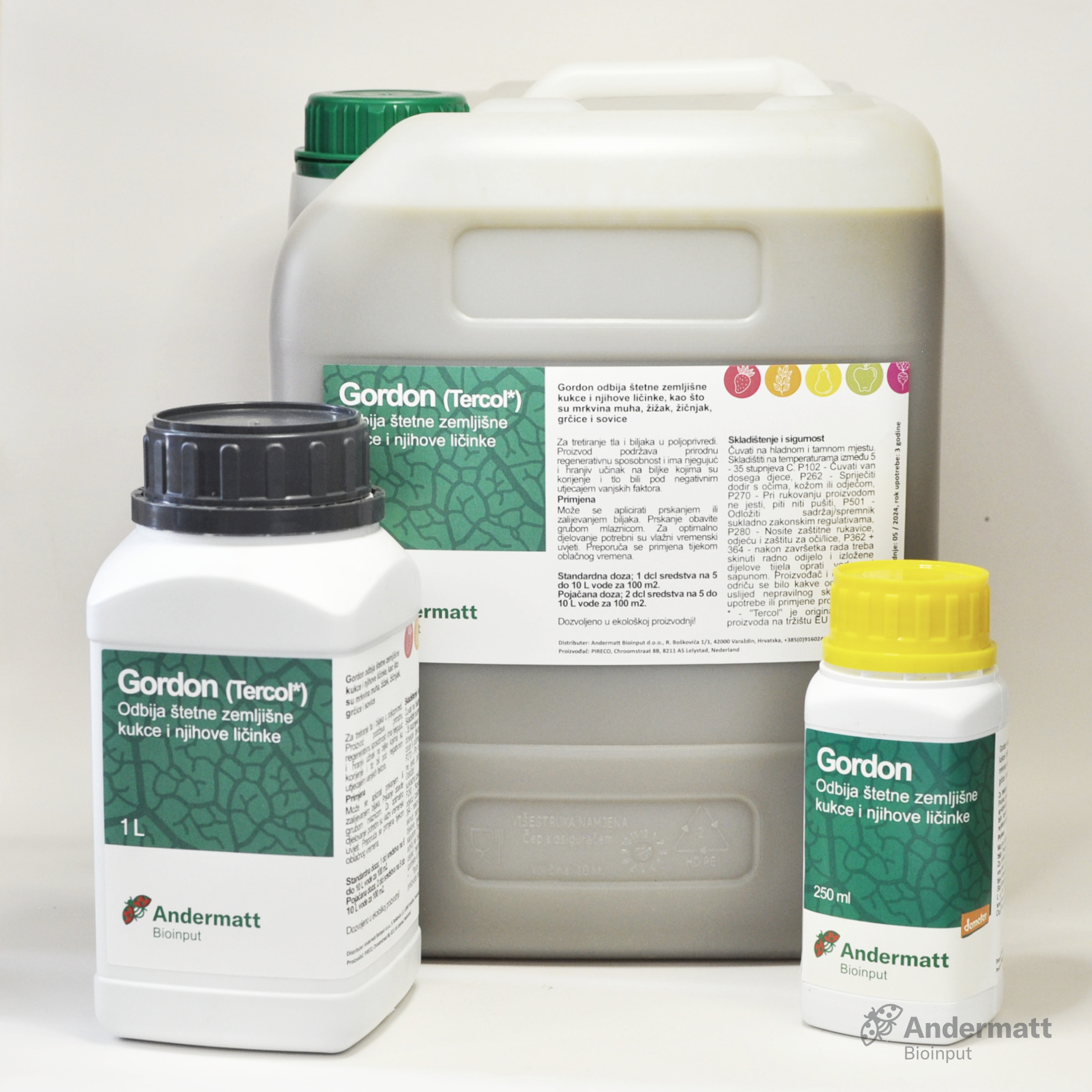 Gordon (Tercol) je sredstvo na bazi biljnih ekstrakata (npr. paprena metvica) i algi koje djeluje repelentno na zemljišne štetnike i njihove ličinke. Apsorbira se kroz korijen biljke i mijenja okus i miris biljnih sokova, čime odbija štetnike i potiče otpornost biljaka iznutra.